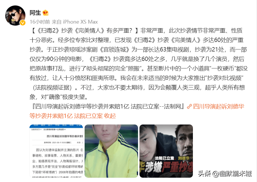 《完满情东说念主》导演阿生(原名苟钰生)亦然人人博纳的董事长,是别称咱们新锐导演,“四川还是妍丽”总制片、总导演、发起东说念主,曾在微博屡次声讨刘德华和片方。